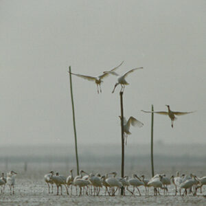 台南曾文溪口黑面琵鷺互上竿打擂台遊戲。-MOFA110064CC-2021-07-PH00059-079